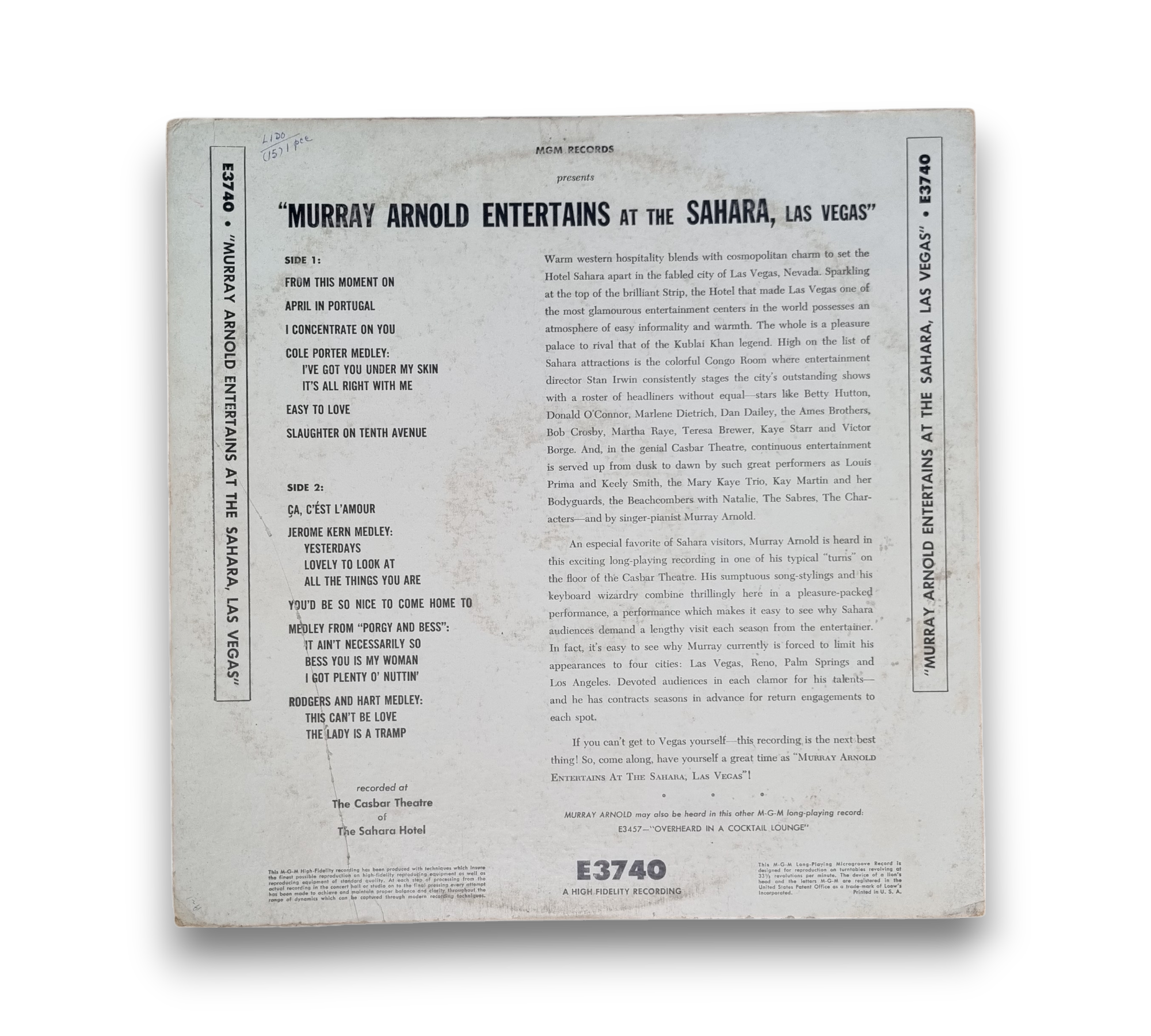 Recorded at The Casbar Theatre of The Sahara Hotel, "Murray Arnold Entertains at the Sahara, Las Vegas" showcases the vibrant atmosphere of one of Las Vegas's iconic venues. This album features a selection of engaging performances that highlight Arnold's talent and charisma. For a closer look at the album's condition and any included packaging, please refer to the accompanying photos.