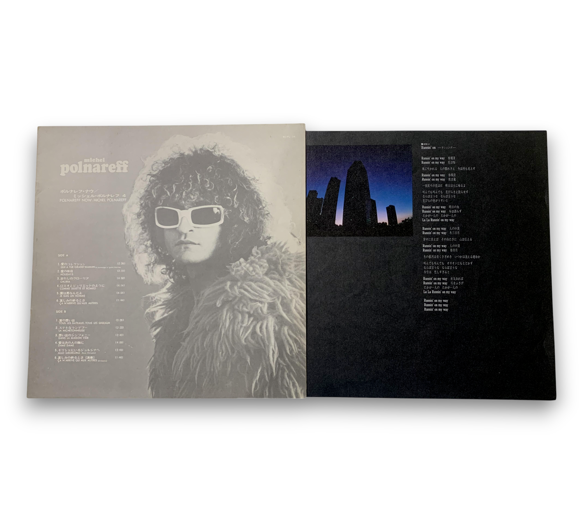 This release is a gatefold 1LP featuring a striking design with a white and yellow label. It includes an 8-page booklet showcasing black and white photographs along with text in both English and Japanese. Notably, the front of the booklet displays the artist's name in Japanese, followed by the number "4": ミッシェル・ポルナレフ 4 (Michel Polnareff 4). The release date is noted as June 1972. For further details regarding the booklet and packaging, please refer to the accompanying photos.