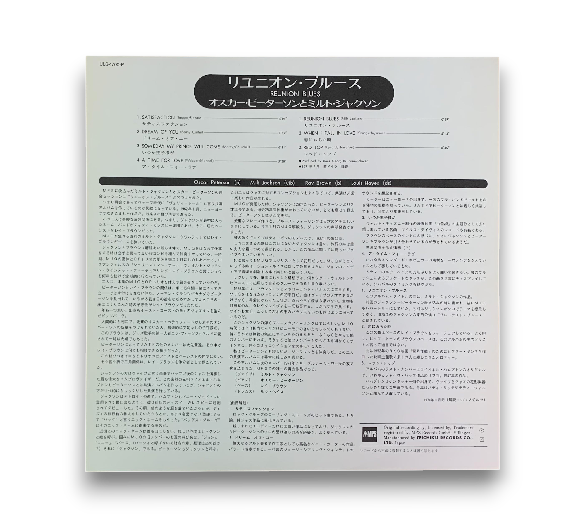 Experience the brilliance of jazz with "Reunion Blues," featuring the exceptional talents of Oscar Peterson, Milt Jackson, Ray Brown, and Louis Hayes. Originally recorded in 1978 at MPS Ton-studio Villingen, this vinyl release showcases a masterful blend of hard bop influences. Manufactured by Teichiku Records in Japan, this album includes a printed insert, making it a valuable addition for any jazz enthusiast. Enjoy timeless tracks like "Satisfaction" and "Reunion Blues" in a high-quality format.