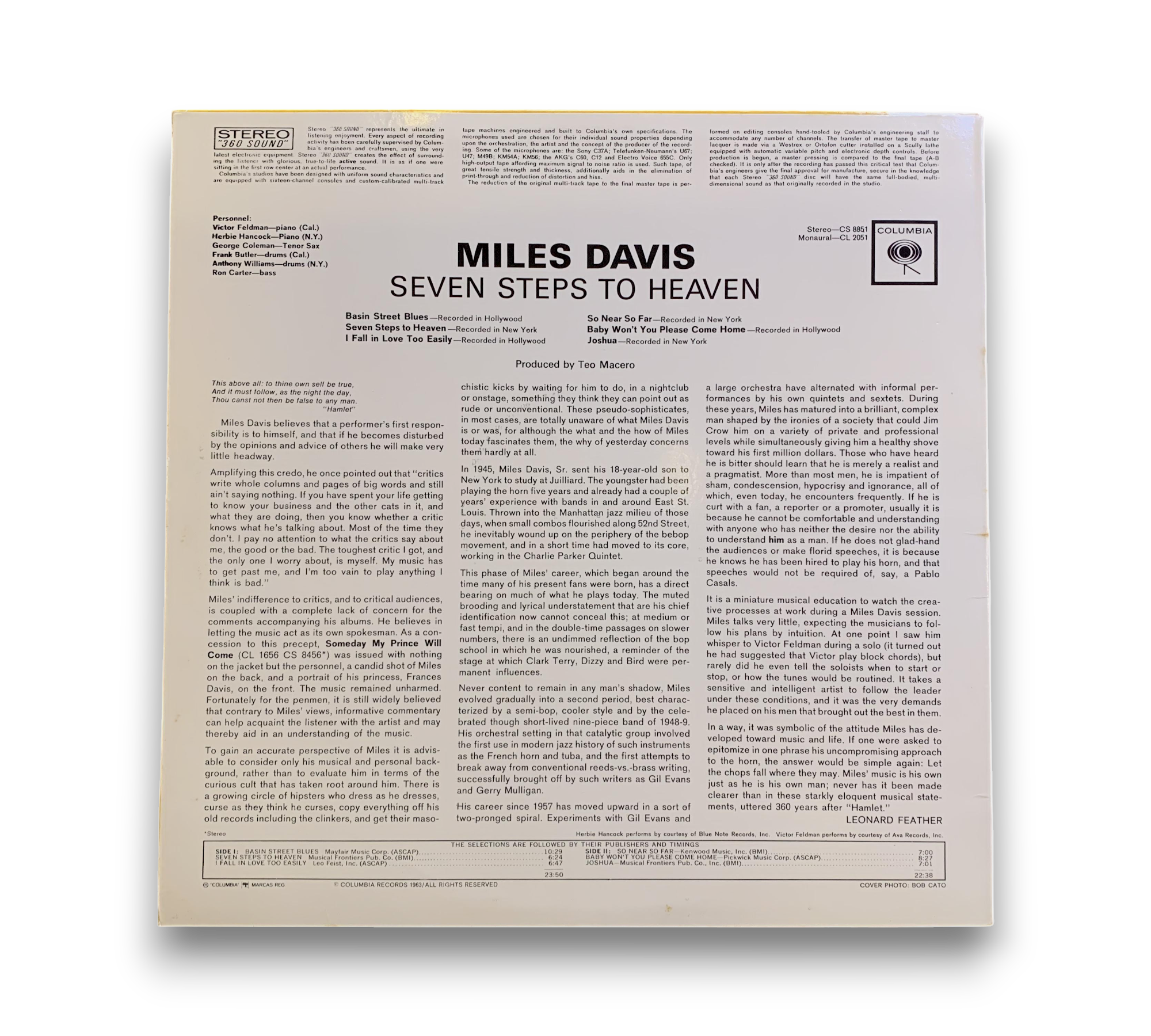 Miles Davis' "Seven Steps to Heaven" is a classic jazz album originally released by Columbia Records in 1963. The record features a collection of tracks showcasing Davis' innovative trumpet work, with contributions from notable musicians such as Herbie Hancock and Victor Feldman. The album is presented in stereo format, with catalog numbers PC 8851 on the front sleeve and CS 8851 on the back cover. Please refer to the accompanying photos for details regarding the condition and any included packaging, as this information may vary.
