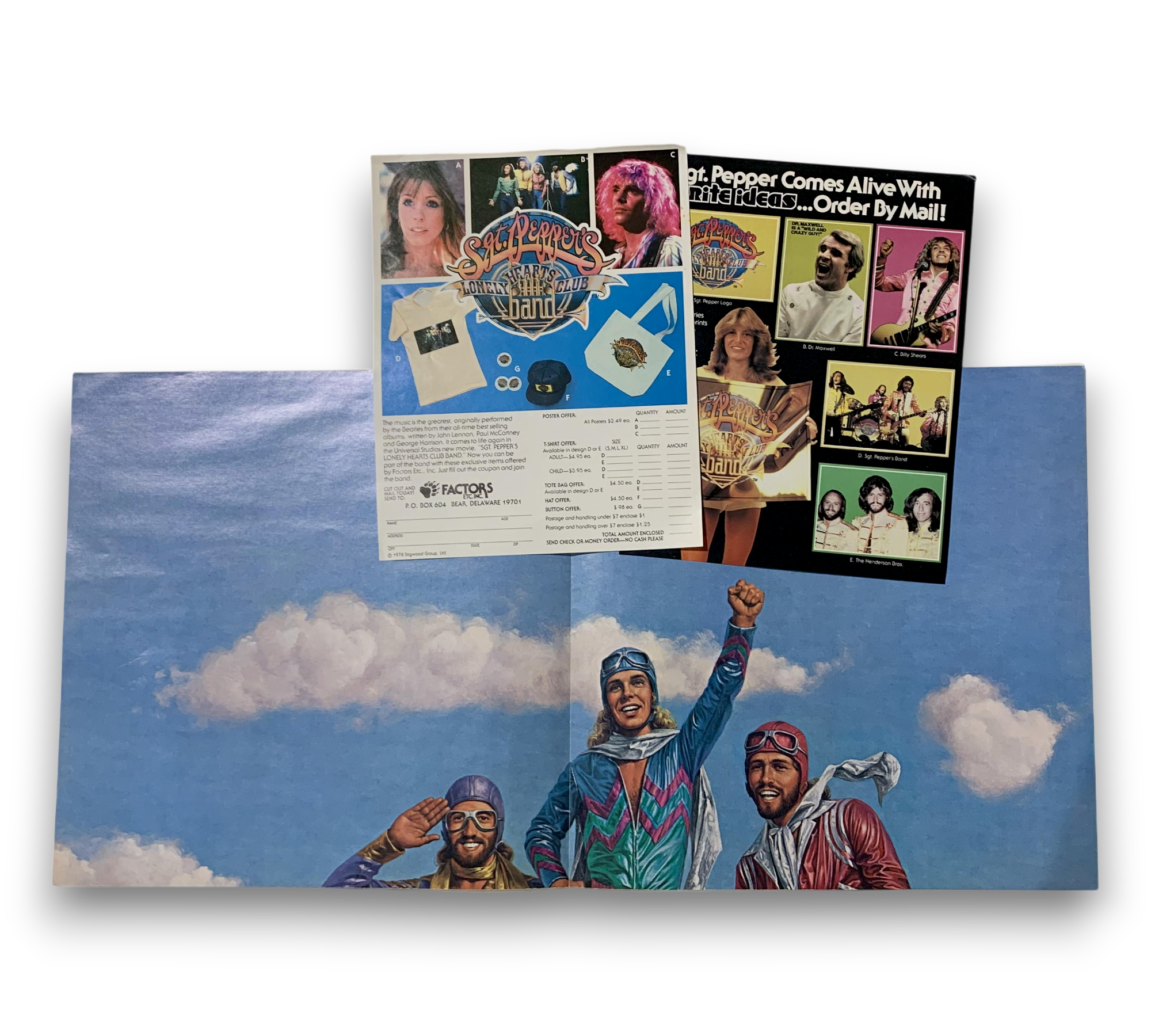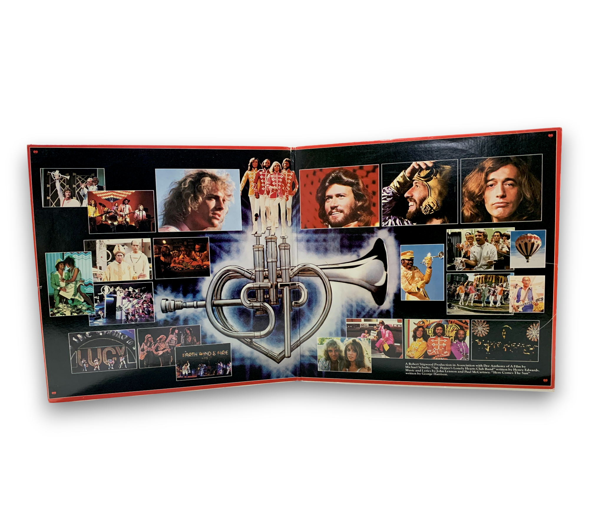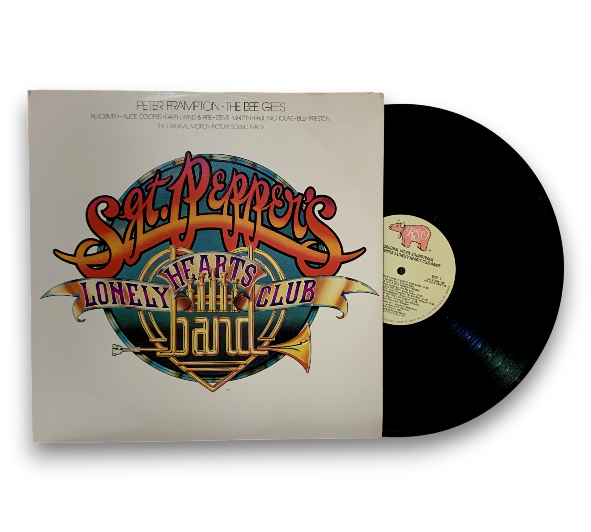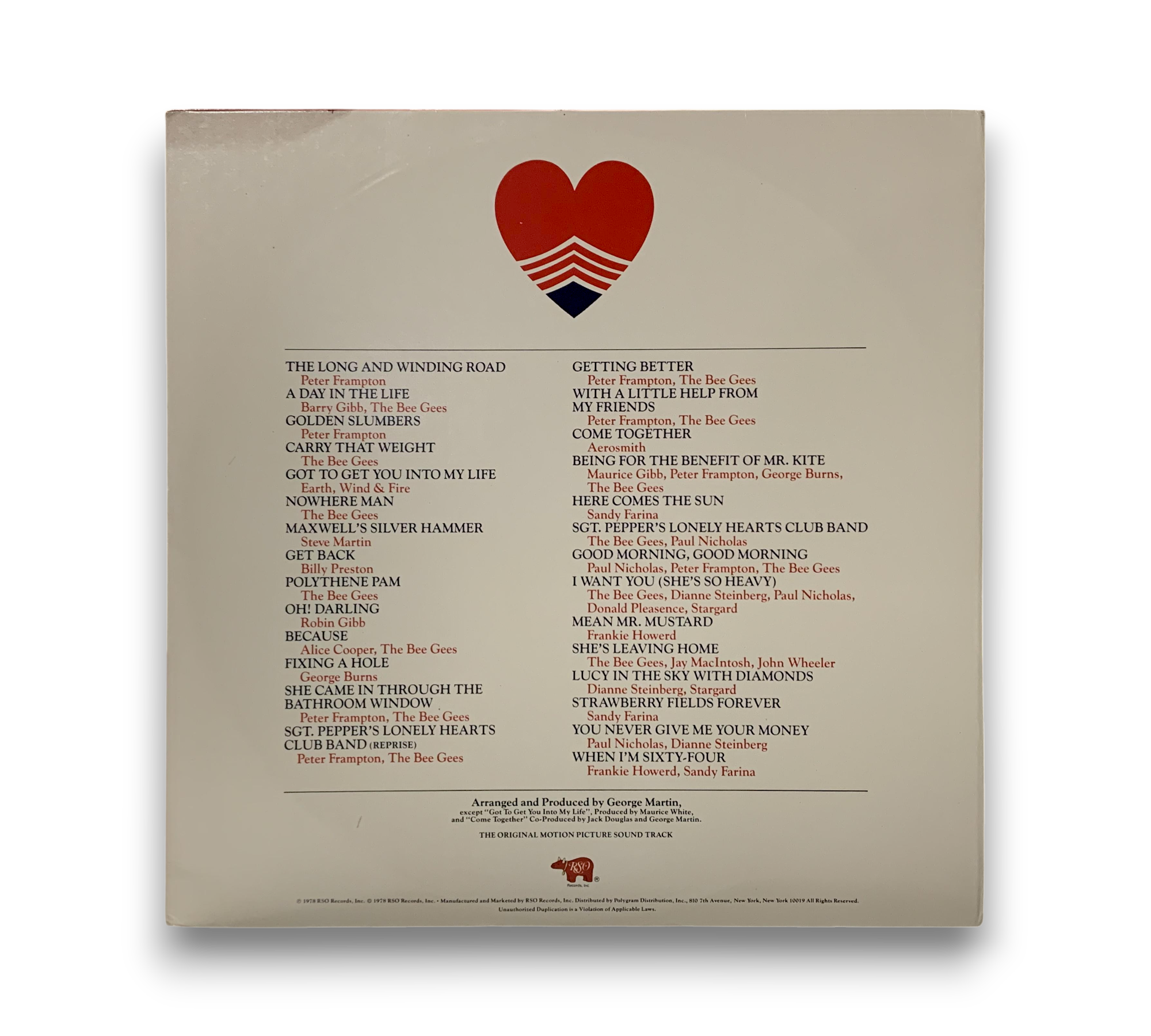 This release is the Original Motion Picture Soundtrack for "Sgt. Pepper's Lonely Hearts Club Band," featuring contributions from artists such as Peter Frampton and The Bee Gees. The album is auto-coupled, with one disc containing sides A and D, while the second disc features sides B and C. It was recorded and mixed at various studios, including Cherokee Studios in Los Angeles and Abbey Road in London. The release includes a poster and two inserts/order forms. For further details regarding the packaging and inserts, please refer to the accompanying photos.