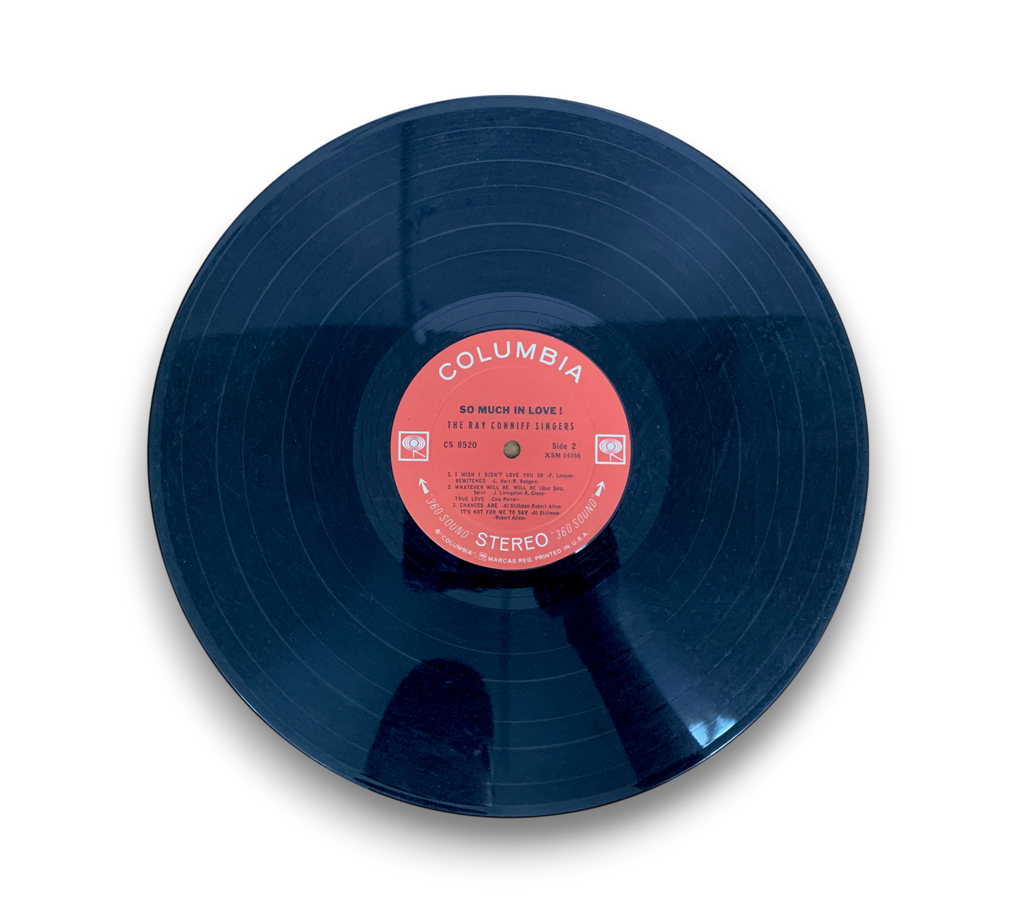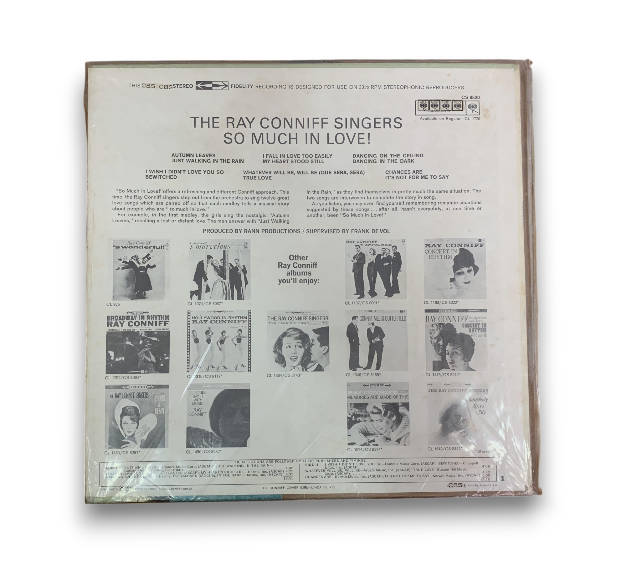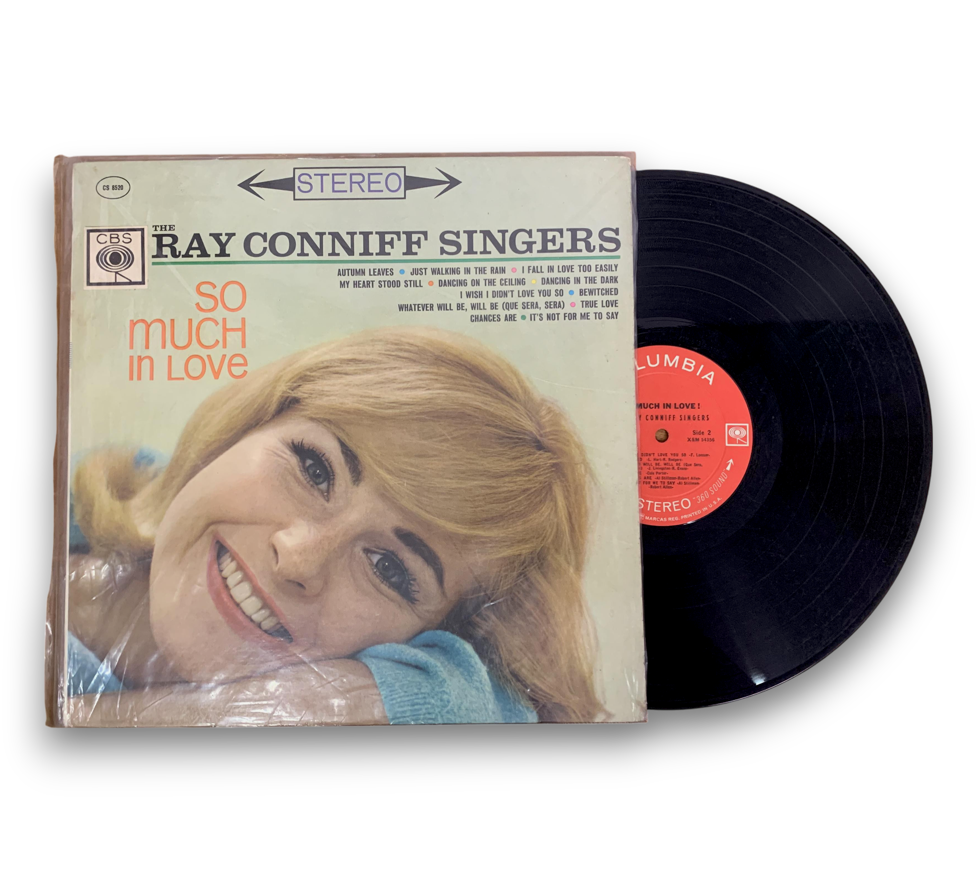 This listing features "So Much in Love!" by The Ray Conniff Singers, released under the CBS label. The cover showcases Linda De Vol, and the album is noted for its "360 Sound" stereo designation in black. The label variant indicates that the text placement differs from other releases. For further details regarding the packaging and inserts, please refer to the accompanying photos.