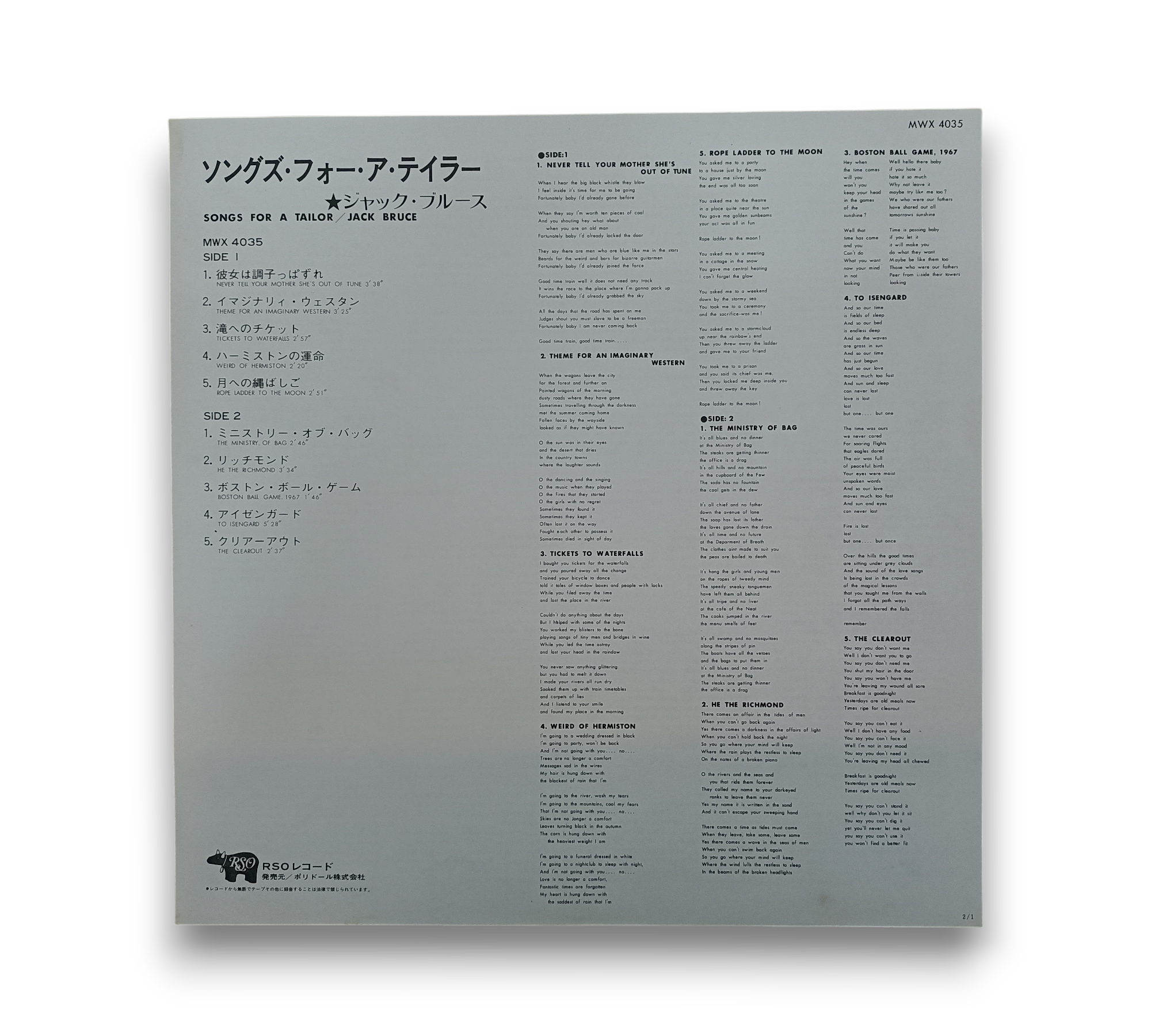 Music composed and arranged by Jack Bruce, with lyrics by Pete Brown, this album features a blend of rock and jazz influences. The release includes a printed lyrics insert in both Japanese and English, providing fans with a deeper connection to the music. For further details regarding the packaging and inserts, please refer to the accompanying photos.