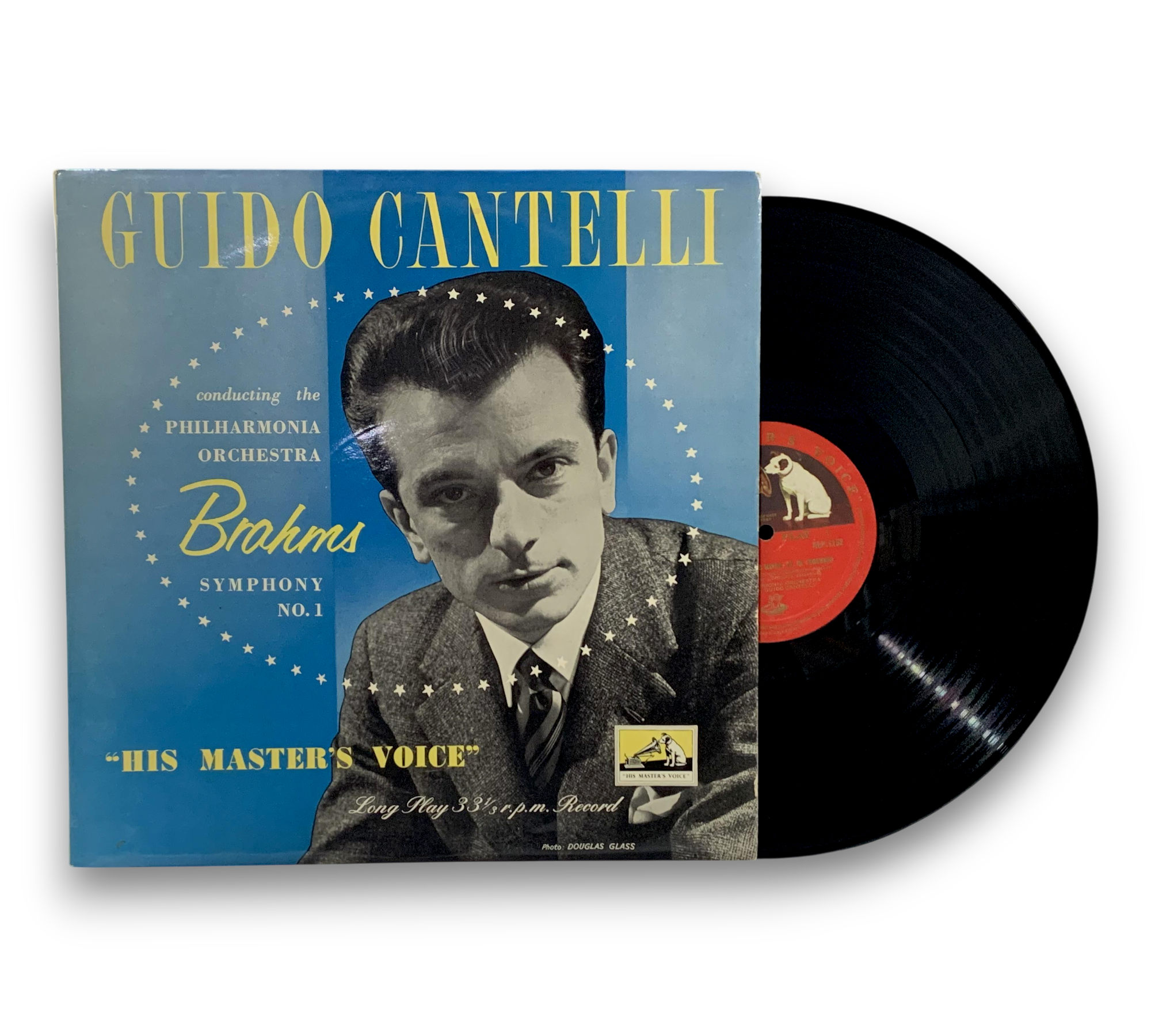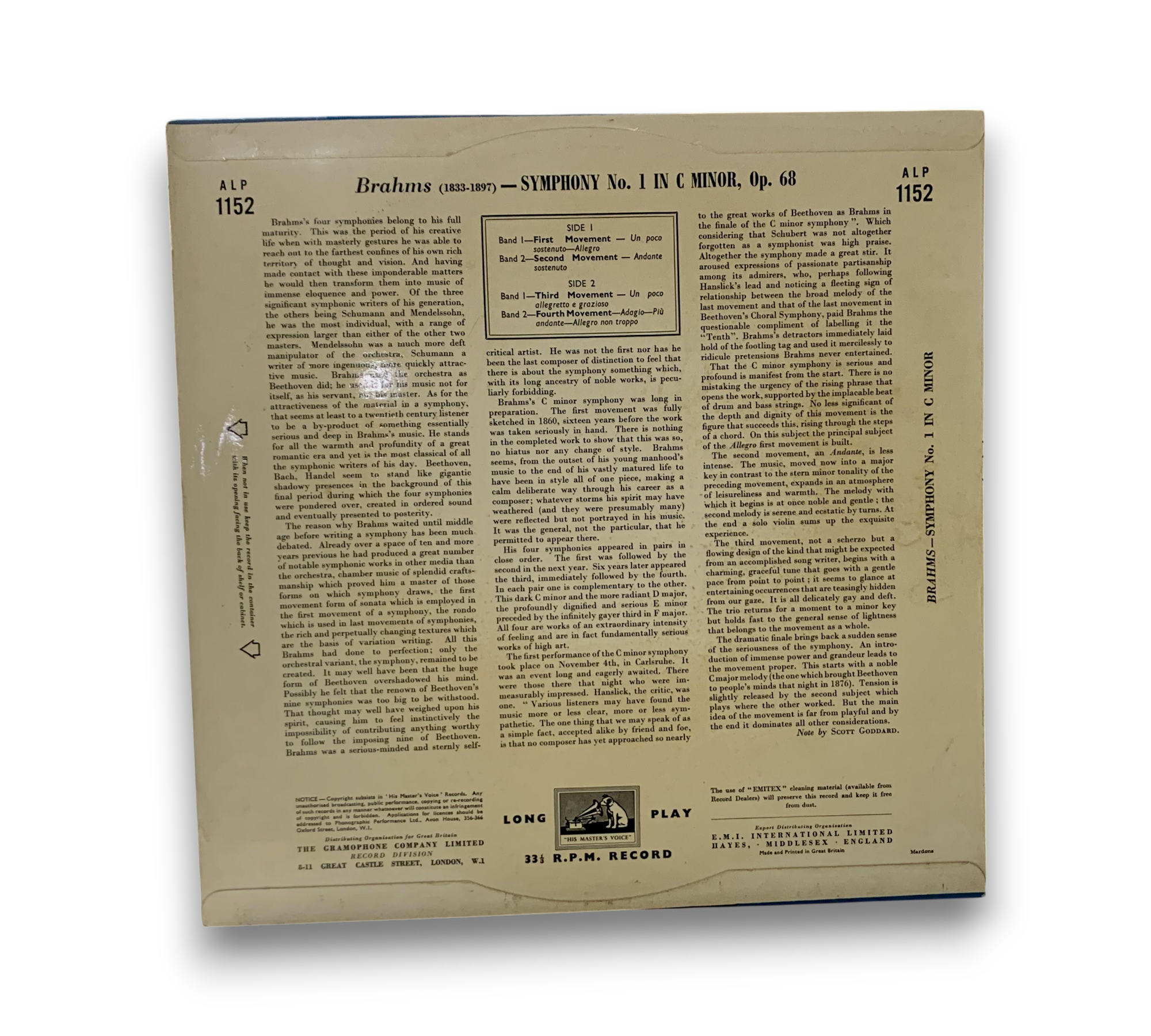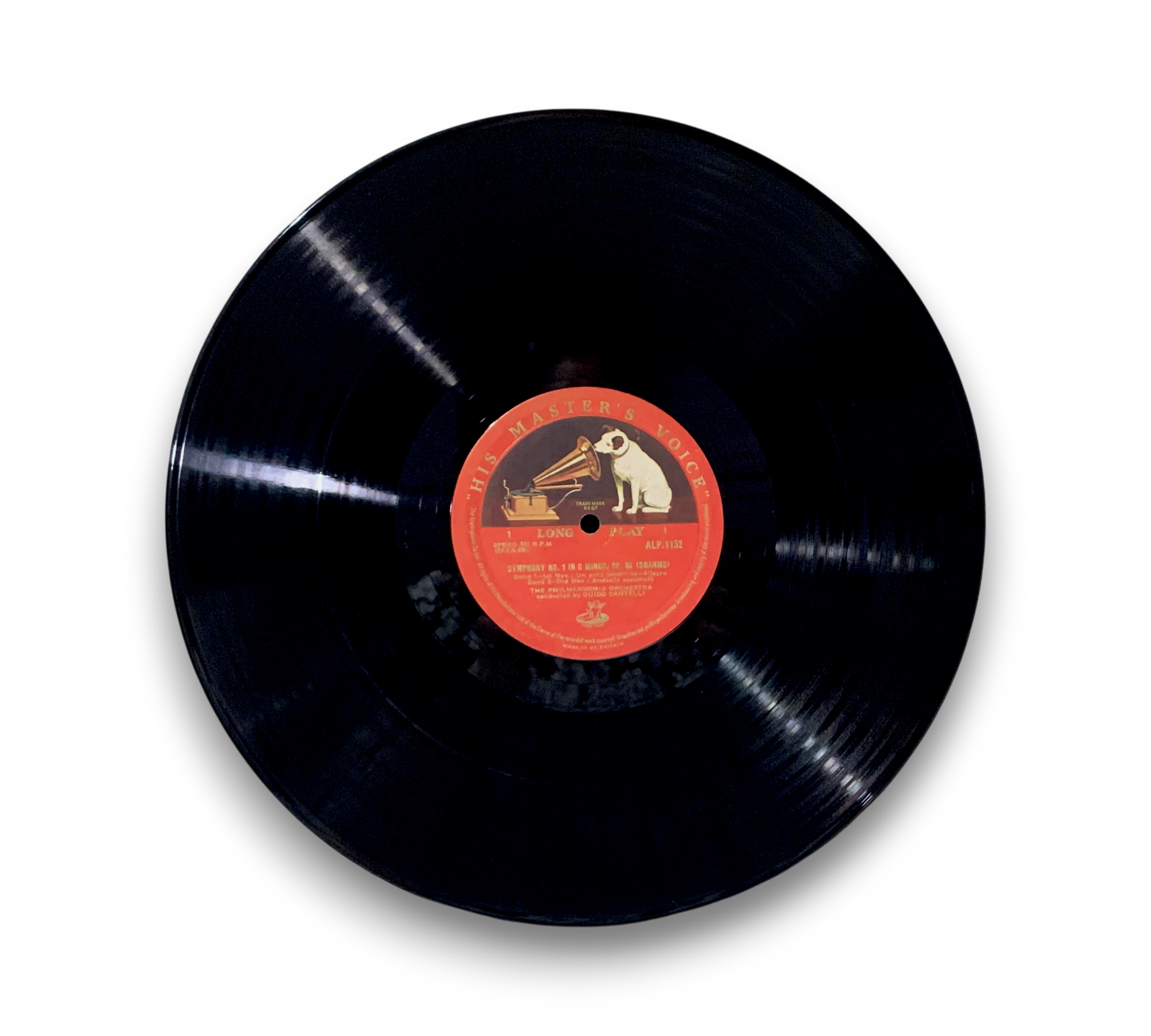 This is a first pressing of Brahms' Symphony No. 1, conducted by Guido Cantelli and performed by the Philharmonia Orchestra, released on the HMV ALP series. The record is noted for its heavy vinyl quality and is a mono edition, with no stereo equivalent available. It was advertised in Gramophone magazine in July 1954. Additional items may be included, but please refer to the accompanying photos for confirmation of any packaging or inserts.