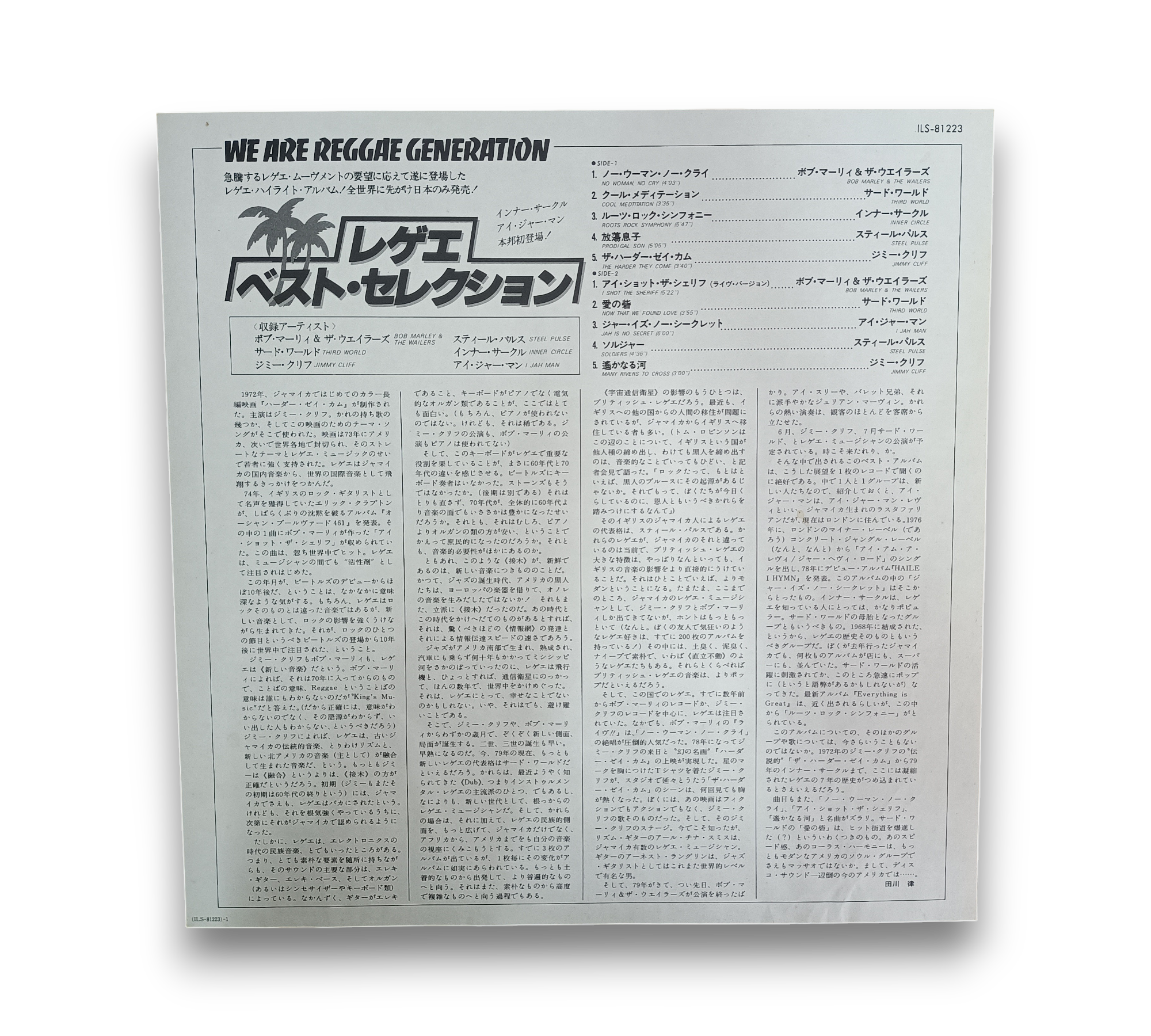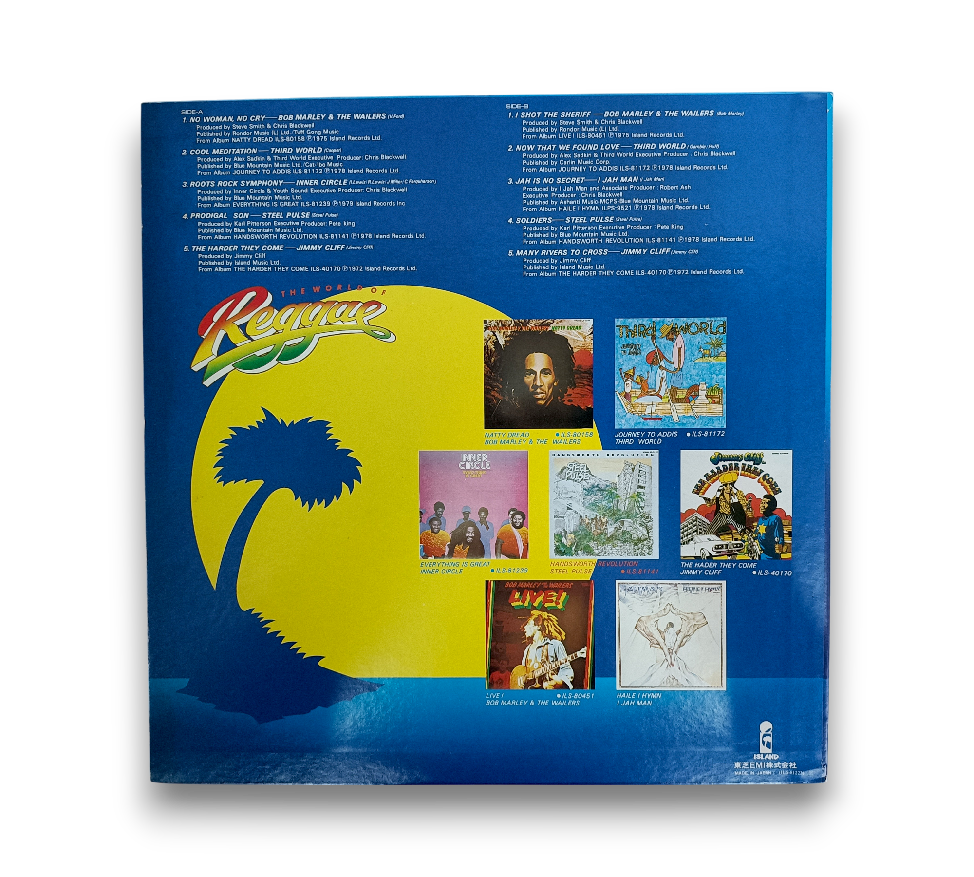 This compilation, titled "The World of Reggae," features a selection of iconic tracks from renowned artists such as Bob Marley & The Wailers, Third World, Jimmy Cliff, Steel Pulse, Inner Circle, and I Jah Man. Released by Toshiba EMI in Japan, this record includes a lyrics insert, enhancing the listening experience. The album showcases a variety of reggae hits, with each track carefully curated to represent the genre's rich history. For further details regarding the packaging and inserts, please refer to the accompanying photos.