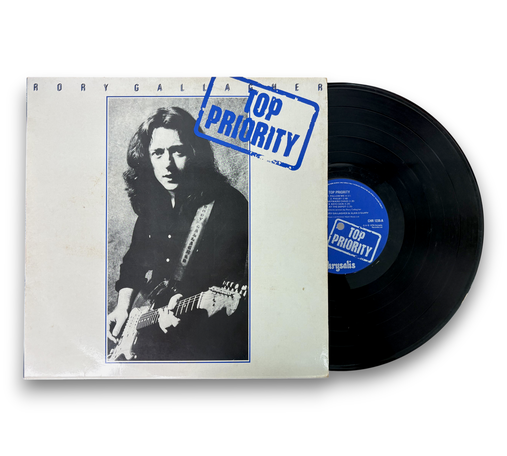 This listing features the album "Top Priority" by Rory Gallagher, presented in a striking blue text sleeve. The front cover showcases a prominent image of Gallagher, while the back features a collection of live performance photographs. The record itself is in excellent condition, with a vibrant blue label. For further details regarding the condition and specifics of the packaging, please refer to the accompanying photos.