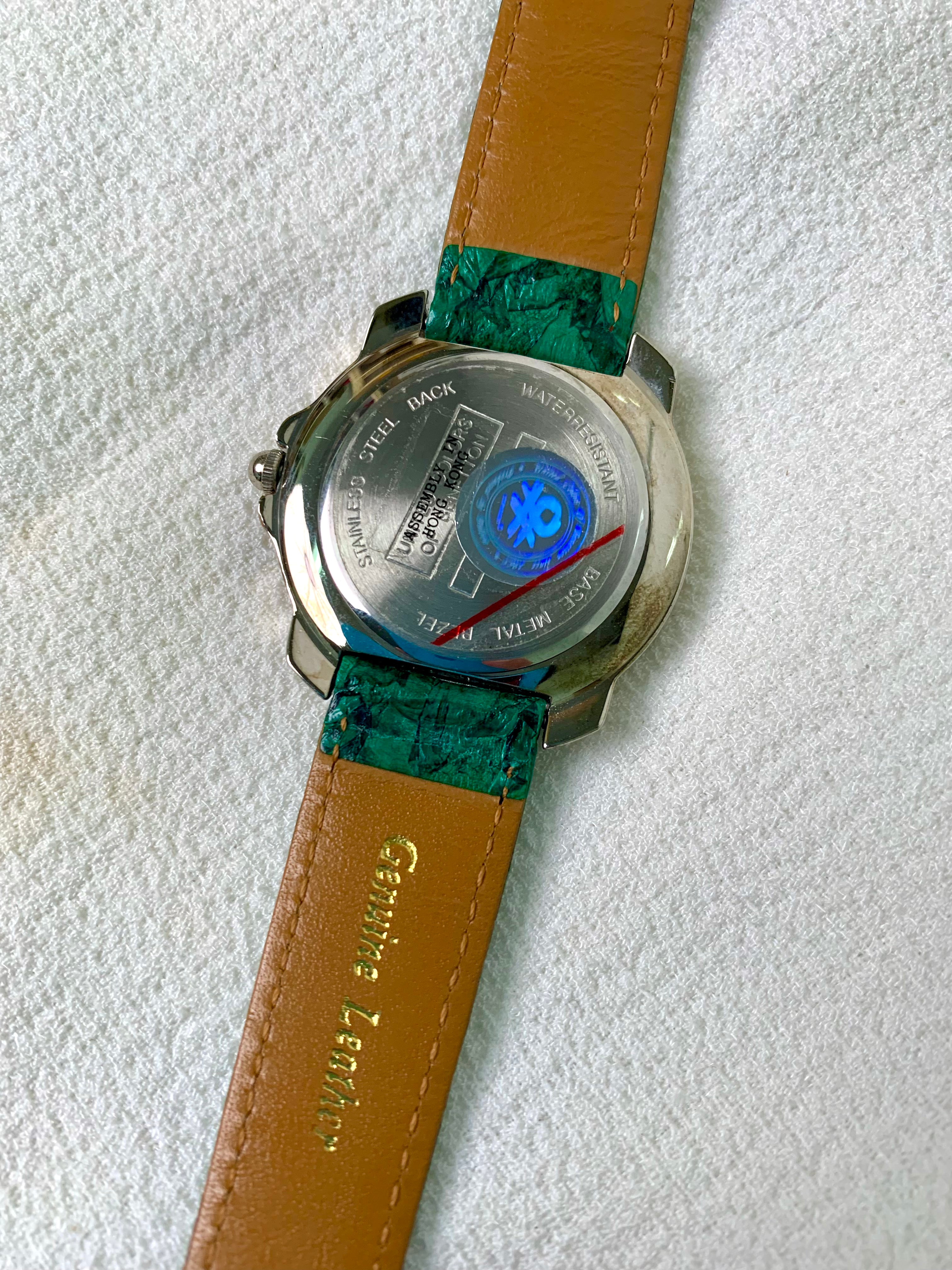 Inspection shows: The crystal has light blemishes, and there are minor scratches on the bezel and case. There is some light discolouration on the metal components, including the buckle. The original leather strap is in excellent condition, and the movement is fully functional.