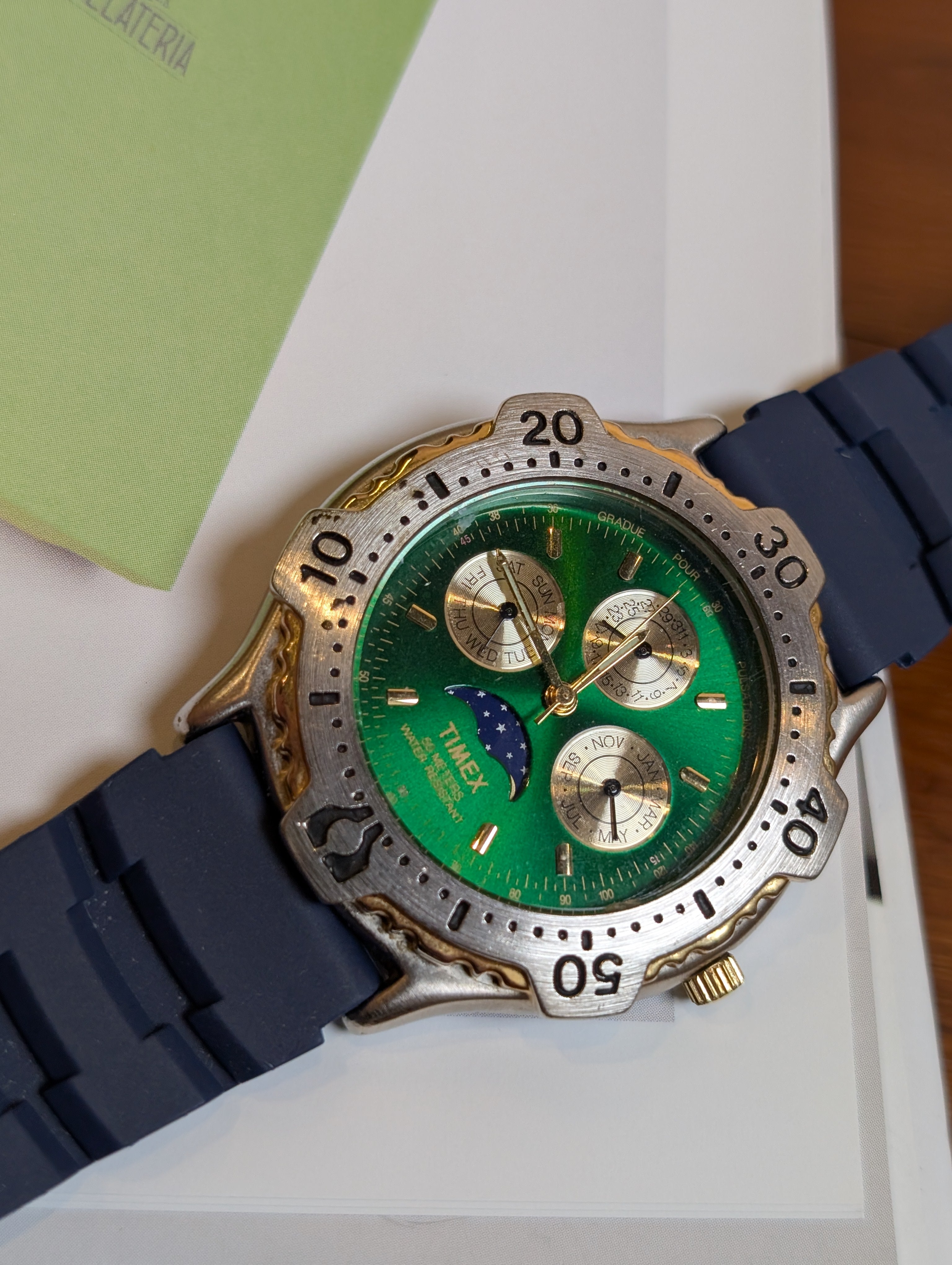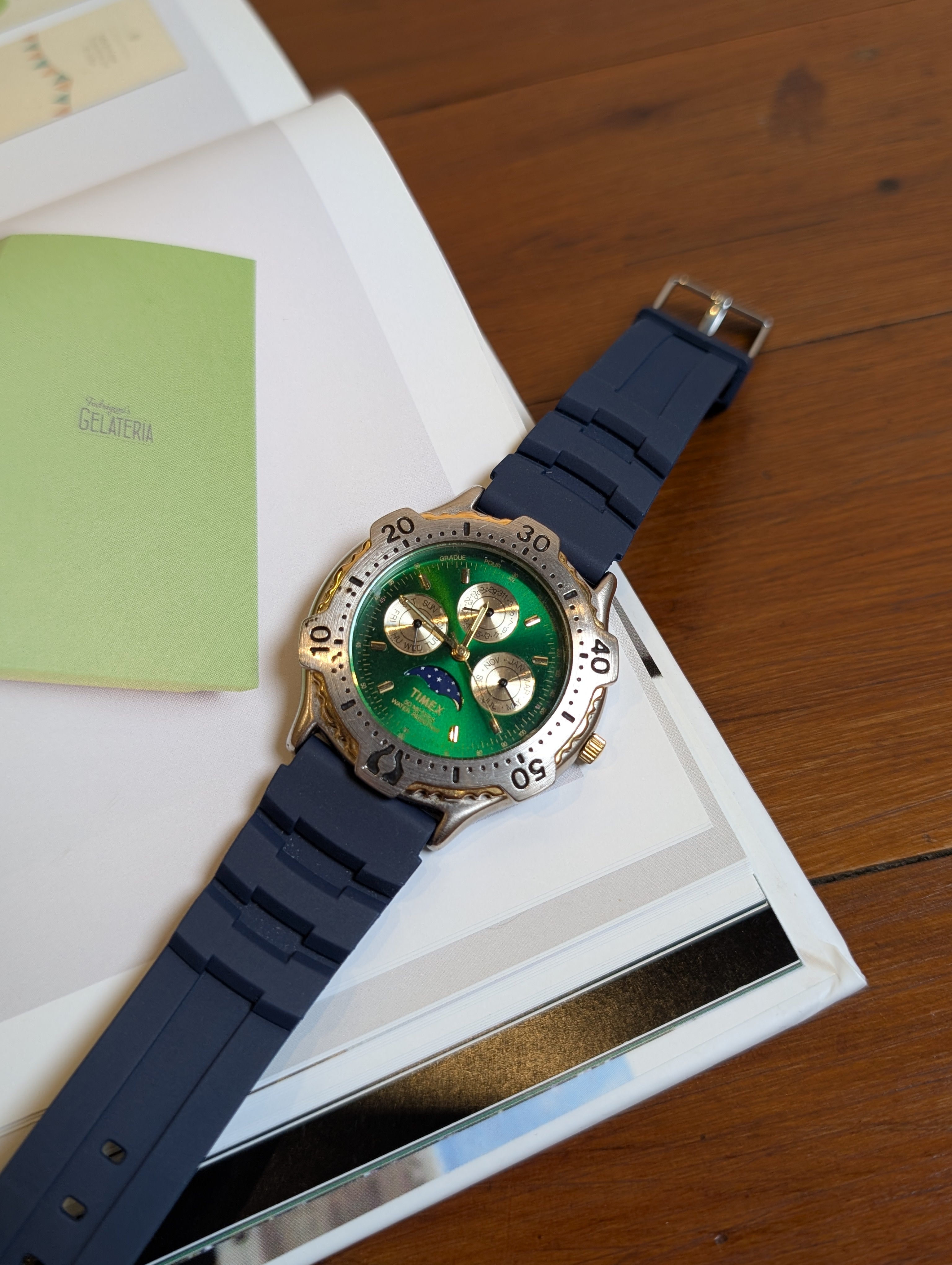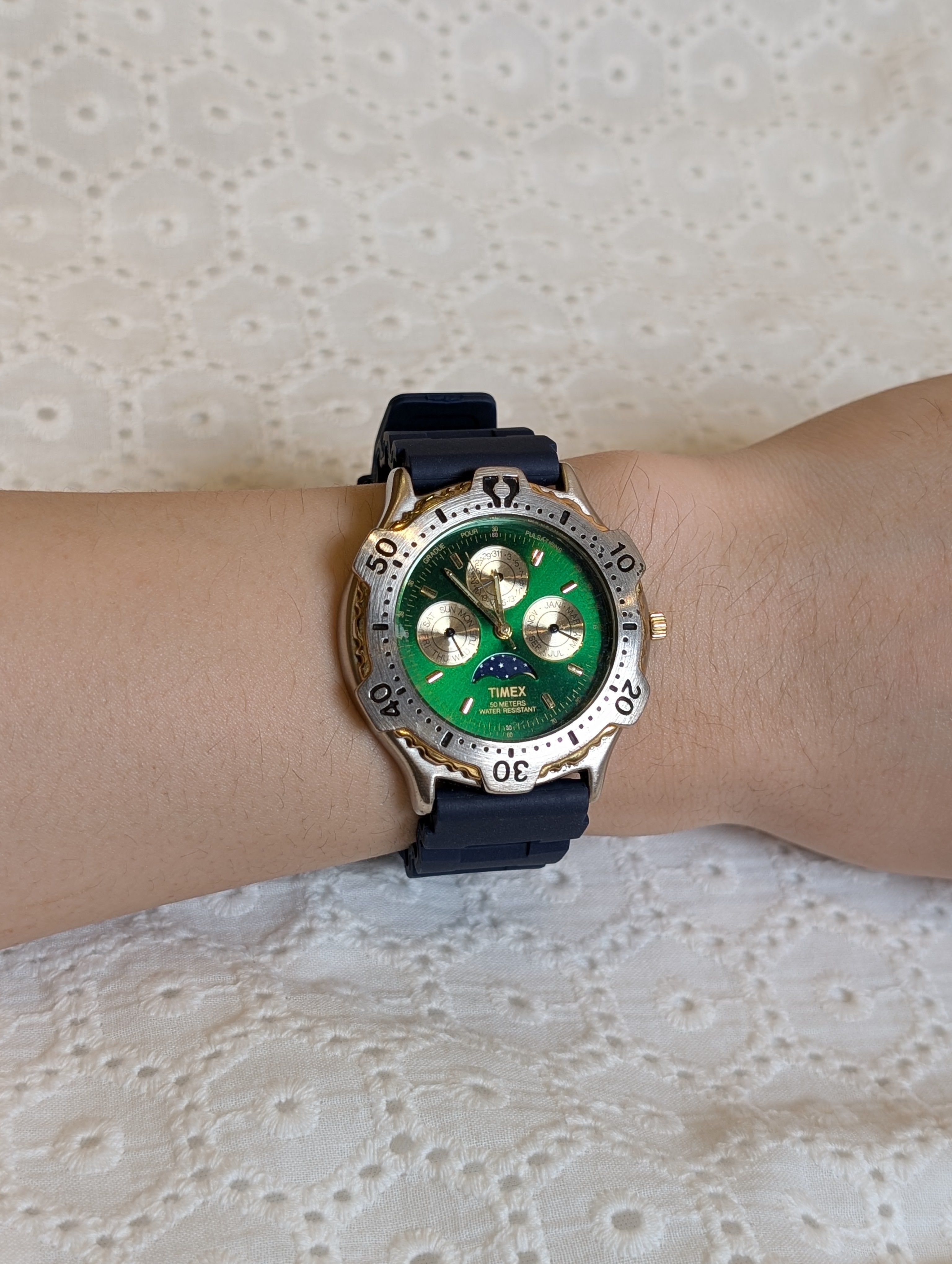Elevate your wristwear with this Vintage Timex Quartz Two-Tone Round Navy Rubber Strap Watch. This unisex timepiece features a striking emerald dial complemented by a durable navy blue rubber strap. The stainless steel case houses a reliable Japanese movement with analog display, complete with chronograph functionality and a handy date display. With a water resistance of up to 50 meters, this watch is as practical as it is stylish, making it a versatile accessory for any wardrobe.